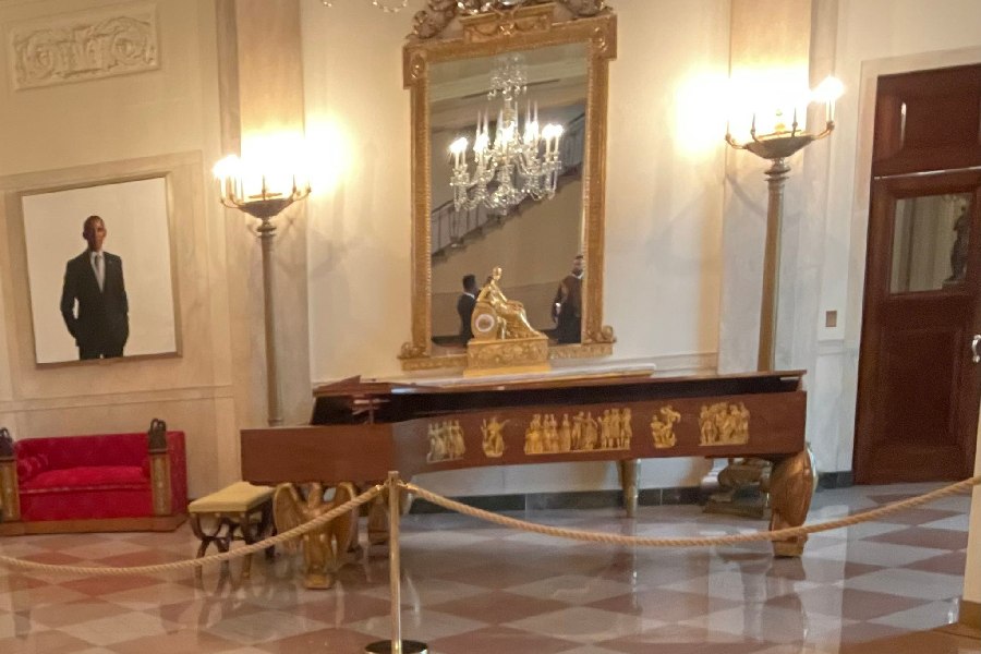 The Obama painting is displayed in a prime spot overlooking former President Franklin D. Roosevelt’s Steinway grand piano in the Grand Foyer of the East Wing.