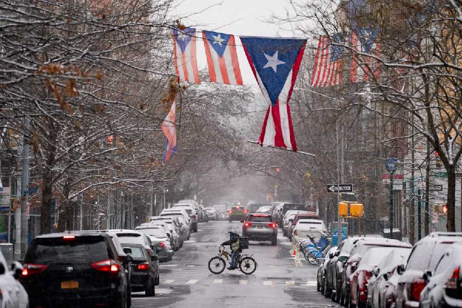 A delivery worker rides a bike down a street during a snowfall in the Harlem Section of New York City, U.S. (Reuters)