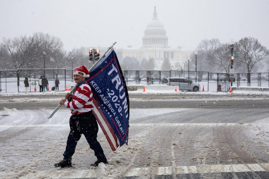 A supporter of U.S. President-elect Donald Trump holds flags and banners near the U.S. Capitol, on the day of a joint session of the Congress to certify Donald Trump's election, as a winter storm that brought snow, ice and freezing temperatures to a broad swath of the U.S. arrived, in Washington, U.S. January 6, 2025. (Reuters)