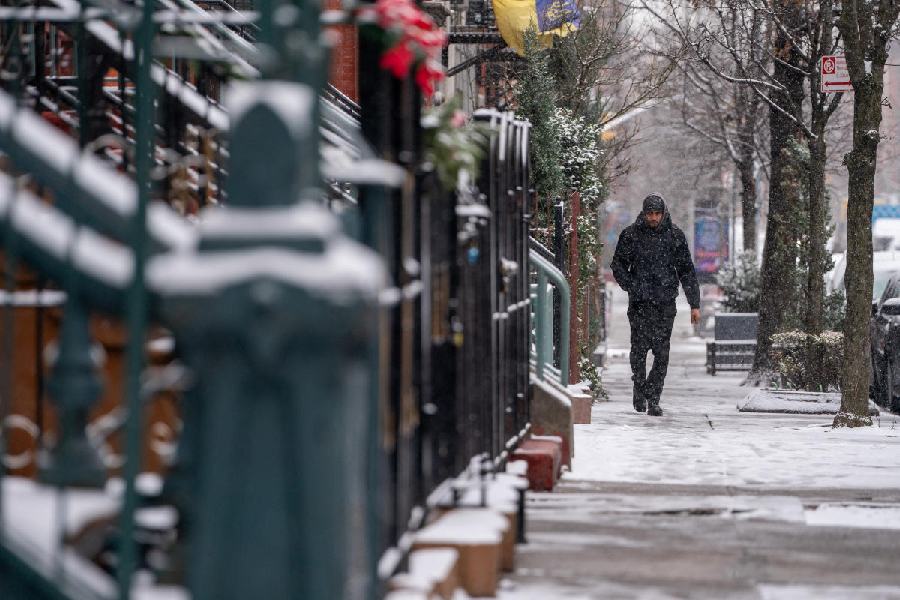 A person walks down the street during a snowfall in the Harlem Section of New York City, U.S., January 6, 2025. (Reuters)
