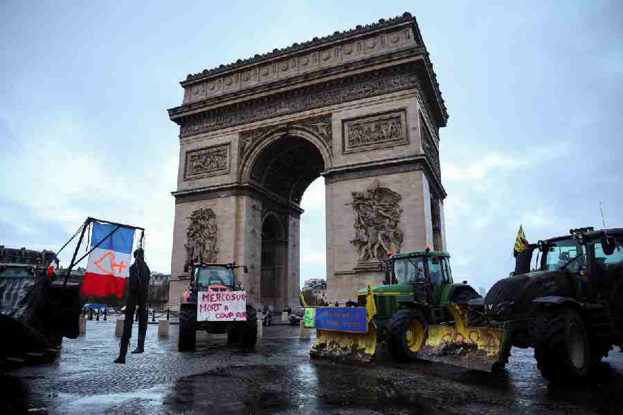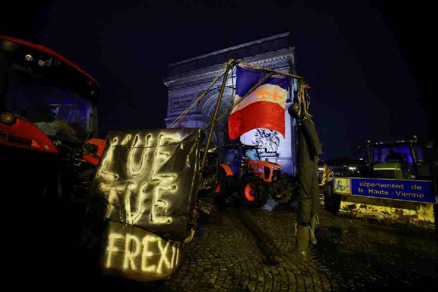 The farmers overran police checkpoints to enter the city, driving along the Champs Elysees avenue and blocking the road around the Arc de Triomphe monument before down on Thursday, while police surrounded them.