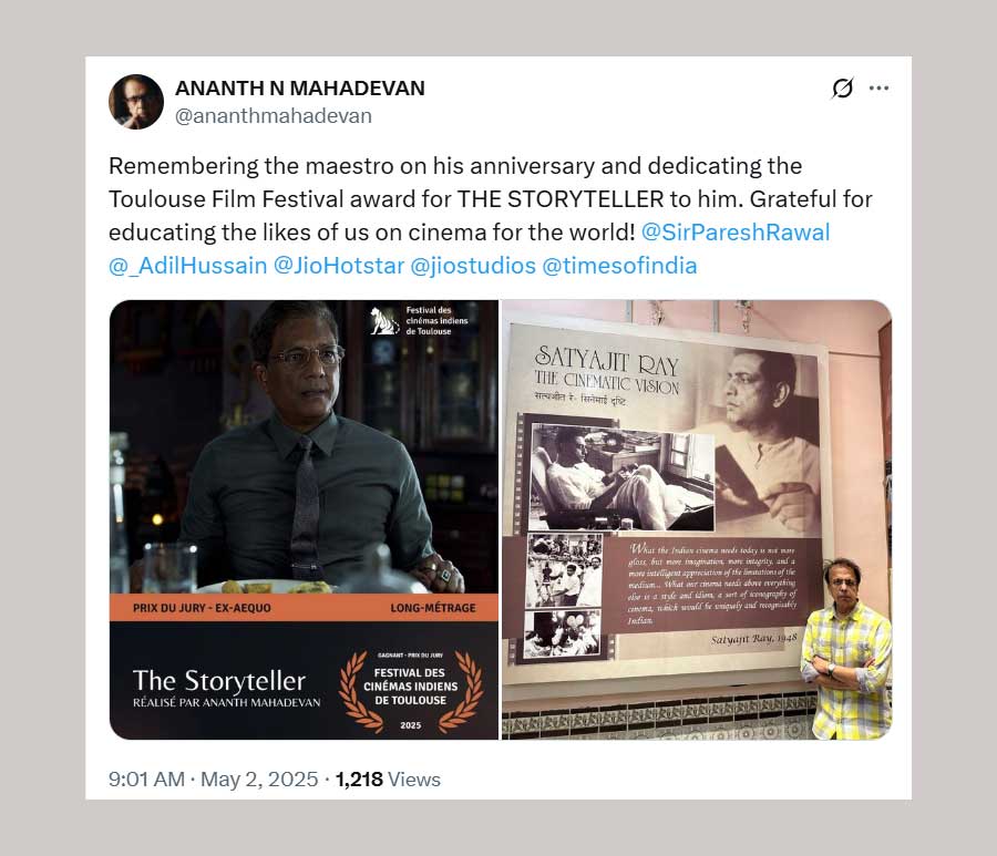 Filmmaker and actor Ananth N Mahadevan said, “Remembering the maestro on his anniversary and dedicating the Toulouse Film Festival award for the storyteller to him. Grateful for educating the likes of us on cinema for the world!”