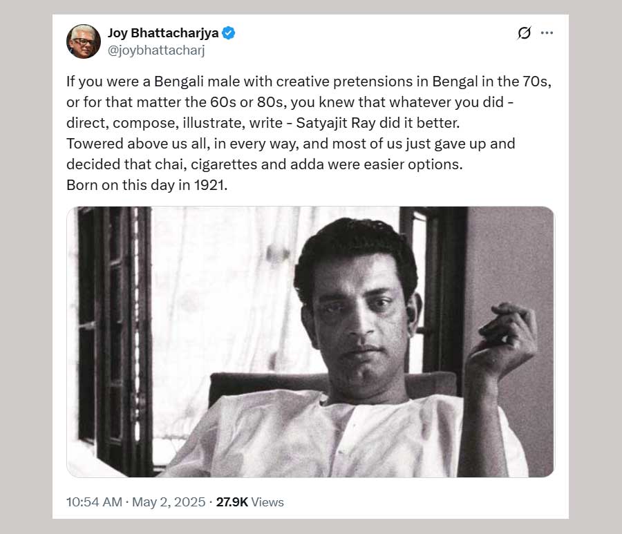 Joy Bhattacharjya, writer and sports producer, shared a personal reflection. He wrote, “If you were a Bengali male with creative pretensions in Bengal in the 70s, or for that matter the 60s or 80s, you knew that whatever you did - direct, compose, illustrate, write - Satyajit Ray did it better. Towered above us all, in every way, and most of us just gave up and decided that chai, cigarettes and adda were easier options.”