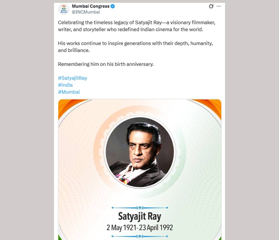 The Mumbai Congress posted, “Celebrating the timeless legacy of Satyajit Ray—a visionary filmmaker, writer, and storyteller who redefined Indian cinema for the world. His works continue to inspire generations with their depth, humanity, and brilliance. Remembering him on his birth anniversary.”