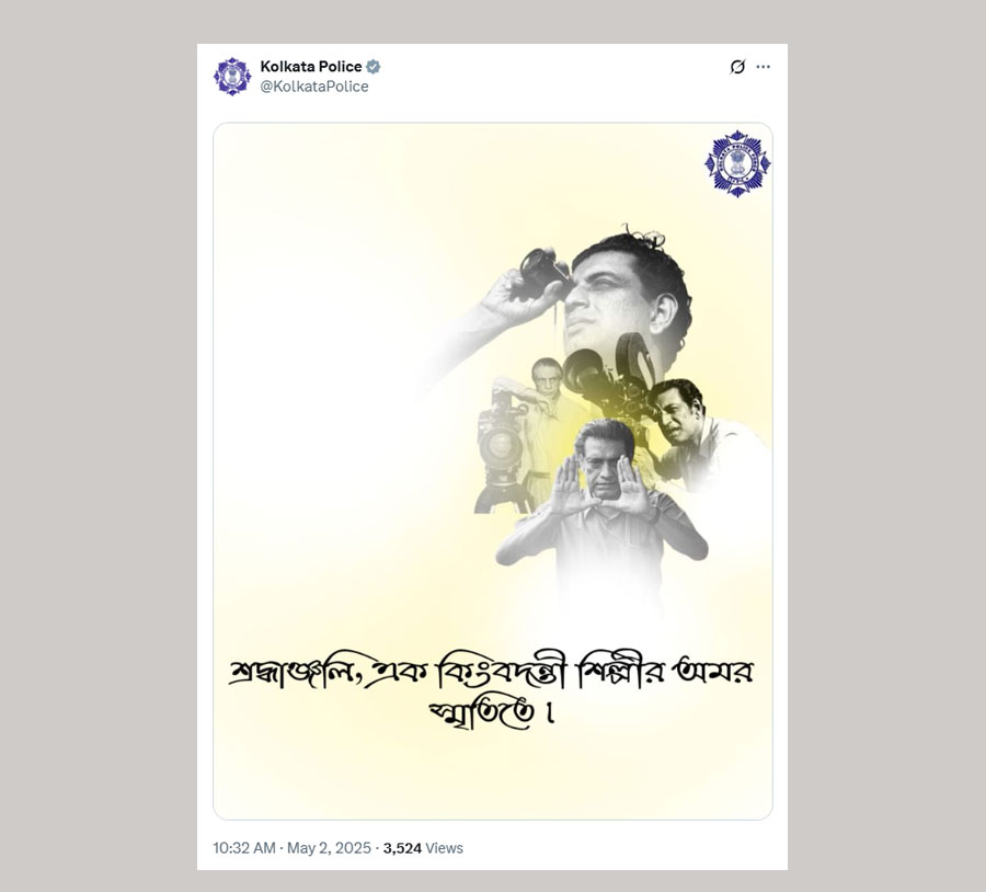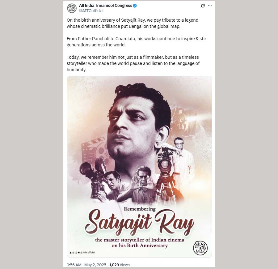 The Trinamool Congress wrote on X, “On the birth anniversary of Satyajit Ray, we pay tribute to a legend whose cinematic brilliance put Bengal on the global map.
