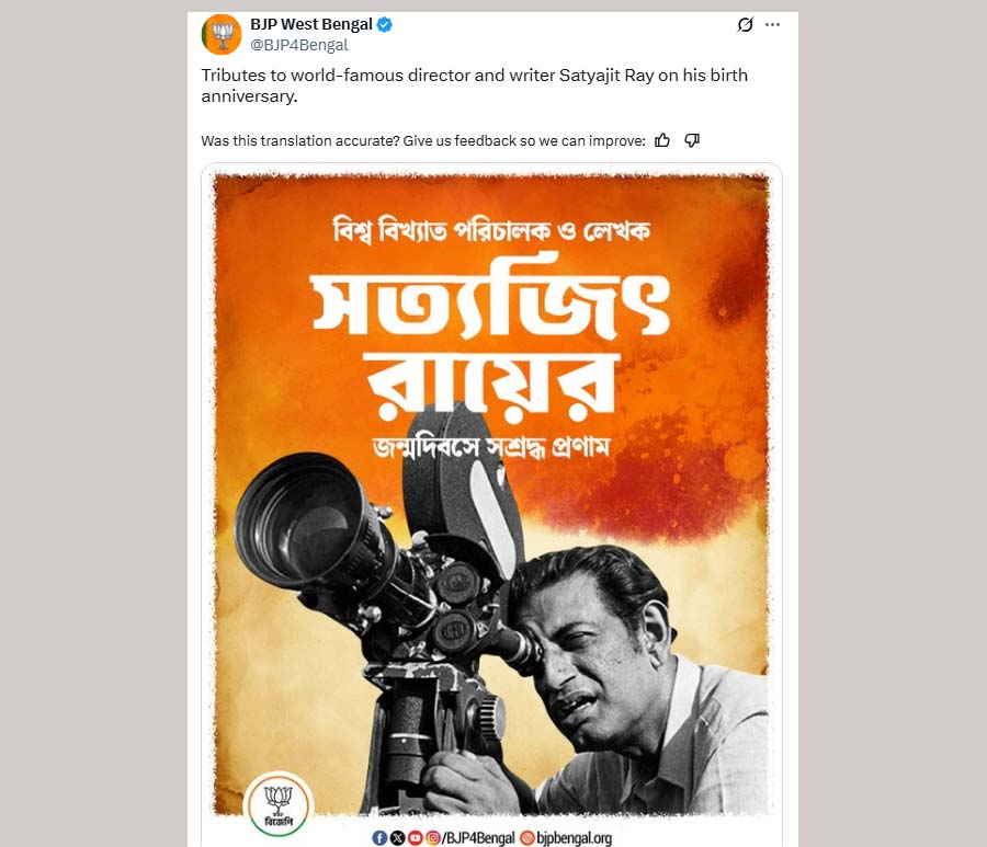 BJP’s West Bengal unit paid tribute, stating, “Respectful homage on the birthday of the world-renowned director and writer Satyajit Ray.”