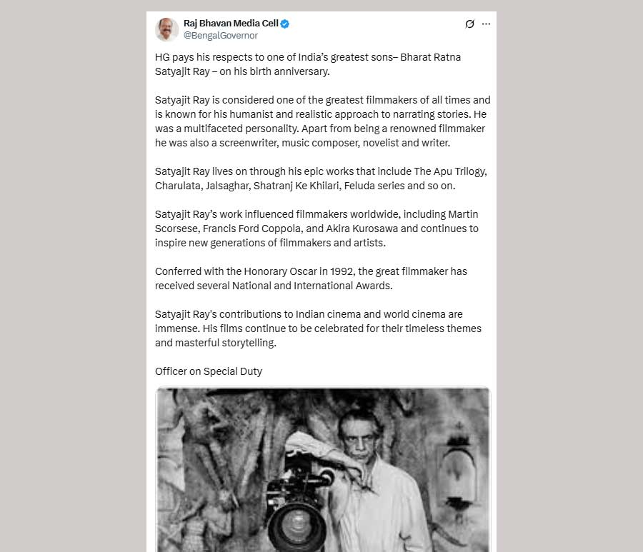 Bengal Governor C.V. Ananda Bose, wrote: “Satyajit Ray is considered one of the greatest filmmakers of all times and is known for his humanist and realistic approach to narrating stories. He was a multifaceted personality.