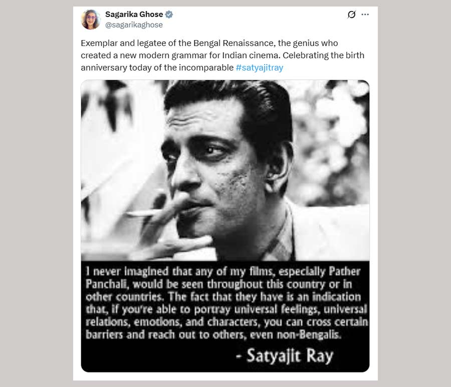TMC leader and Rajya Sabha MP Sagarika Ghose wrote, “Exemplar and legatee of the Bengal Renaissance, the genius who created a new modern grammar for Indian cinema. Celebrating the birth anniversary today of the incomparable.”