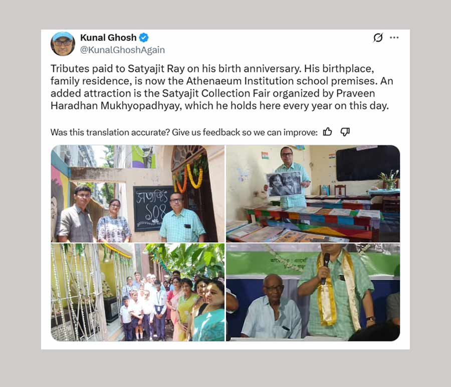 TMC spokesperson Kunal Ghosh noted: “A tribute on Satyajit Ray's birth anniversary. His birthplace, the family residence, now within the premises of Atheneum Institution School. Added attraction, the Satyajit Collection Fair organized by veteran Haradhan Mukhopadhyay, which he holds here every year on this day.”
