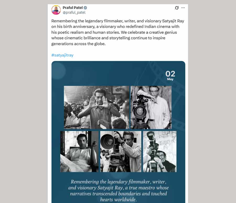Praful Patel, Rajya Sabha MP and NCP leader, said, “Remembering the legendary filmmaker, writer, and visionary Satyajit Ray on his birth anniversary, a visionary who redefined Indian cinema with his poetic realism and human stories. We celebrate a creative genius whose cinematic brilliance and storytelling continue to inspire generations across the globe.”