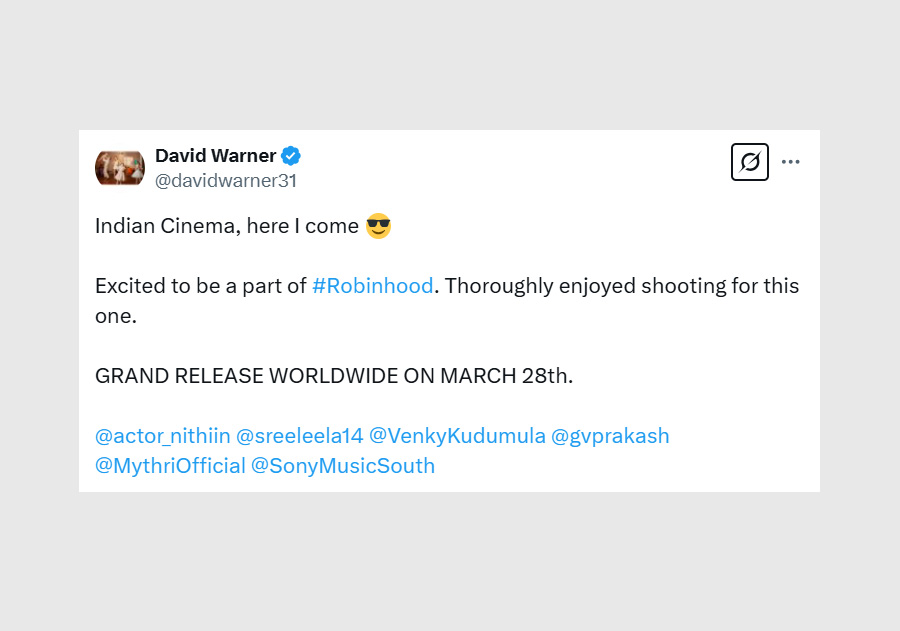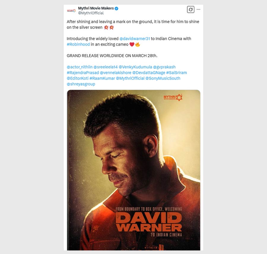 Australian cricketer David Warner is set to make his debut in Indian cinema with a cameo role in the upcoming Telugu heist-comedy entertainer, Robinhood, starring Nithiin and Sreeleela.