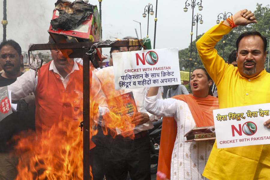 Protests erupted across the country on Sunday as India prepared to face Pakistan in Dubai, with families of April’s Pahalgam terror attack victims calling the cricket clash a betrayal.