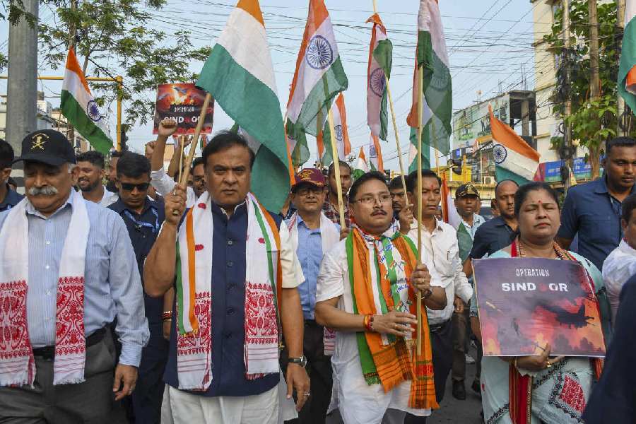 Assam Chief Minister Himanta Biswa Sarma along with State BJP President Dilip Saikia and others takes part in a 'Tiranga Yatra' to express solidarity with the Indian armed forces following the Operation Sindoor, in Guwahati, Wednesday, May 14, 2025. (PTI)