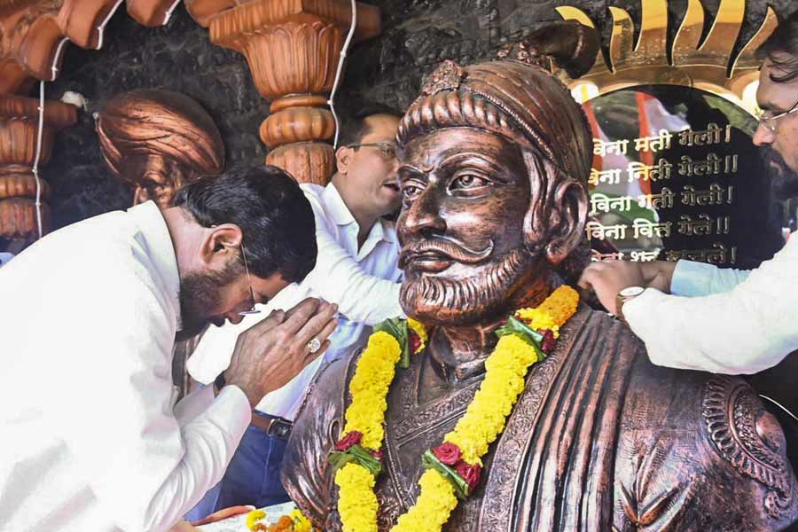 In this image released by @mieknathshinde via X on May 14, 2025, Maharashtra Deputy Chief Minister Eknath Shinde pays tribute to Chhatrapati Shivaji Maharaj before the start of the 'Tiranga Yatra', in solidarity with Indian armed forces, in Thane, Maharashtra. (PTI)