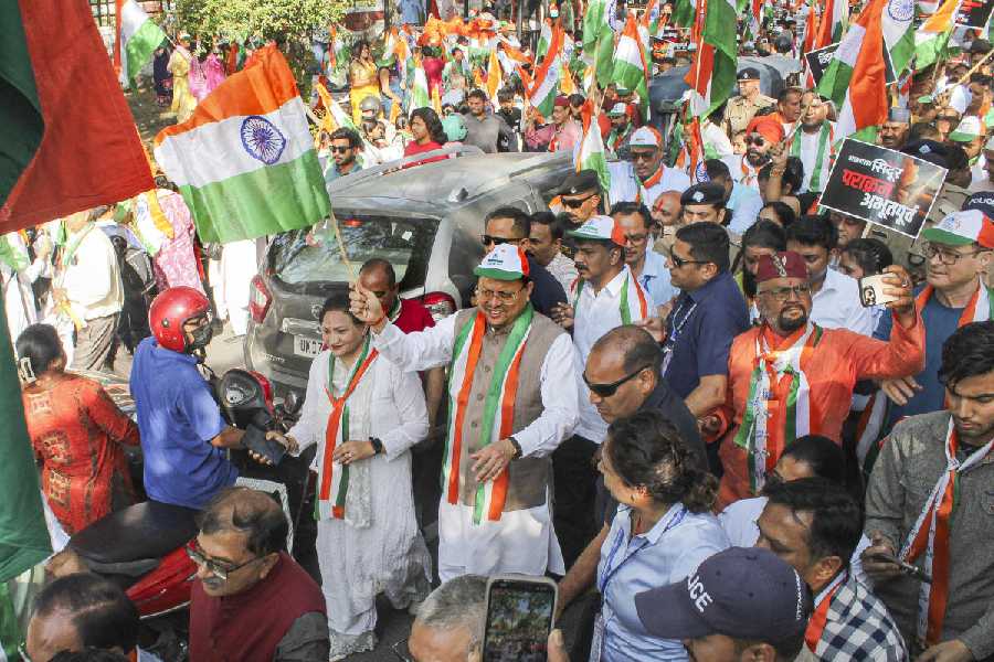 Uttarakhand Chief Minister Pushkar Singh Dhami takes part in a 'Tiranga Yatra' to express solidarity with the Indian armed forces, in Dehradun, Wednesday, May 14, 2025. (PTI)