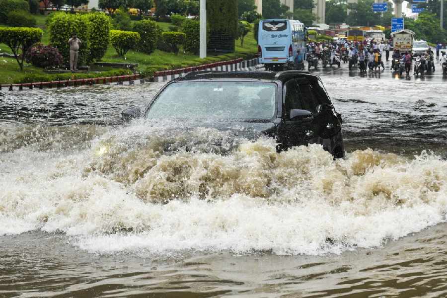 A vehicle cautiously navigates through a waterlogged street in New Delhi, where heavy rains have turned roads into rivers. The ongoing monsoon has caused widespread flooding, disrupting daily life in the capital.