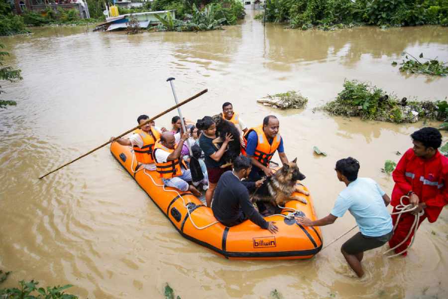 In Agartala, personnel from the Tripura Disaster Management Authority are seen evacuating residents from flood-affected areas. The region has been severely impacted by heavy rainfall, forcing many to leave their homes for safety.