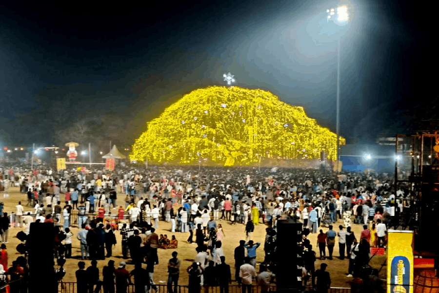 People gather near an 80-foot tall 200-year-old rain tree illuminated with lights and decoratives on New Year’s eve, at Veli Ground, in Kochi, Kerala, Wednesday, Dec. 31, 2025. (PTI)
