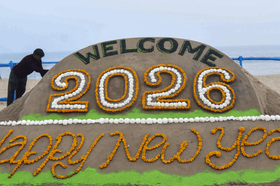 Sand artist and Padma Shri awardee Sudarsan Pattnaik creates a sculpture on New Year eve, at the beach in Puri, Odisha, Wednesday, Dec. 31, 2025. (PTI)