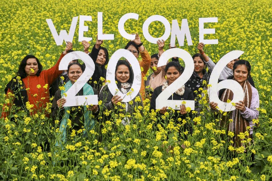 Women pose for a picture holding ‘Welcome 2026’ cut-outs on the New Year’s Eve, in Moradabad, Wednesday, Dec. 31, 2025. (PTI)