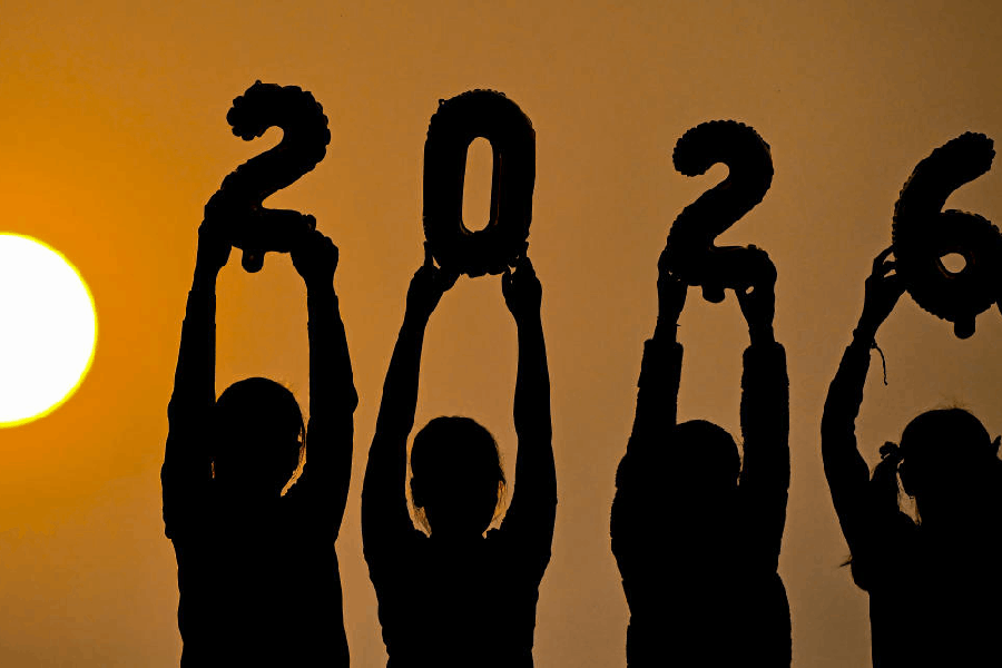 People pose for a picture holding ‘2026’ balloons silhouetted against the last sunset of 2025, in Nadia, Wednesday, Dec. 31, 2025. (PTI)