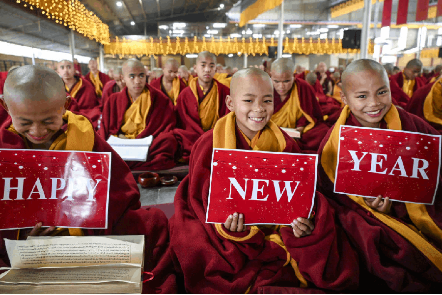 Tibetan novice monks hold 'Happy New Year' placards during the '40th Kagyu Monlam' prayer ceremony on New Year's eve, in Bodh Gaya, Bihar, Wednesday, Dec. 31, 2025. (PTI)