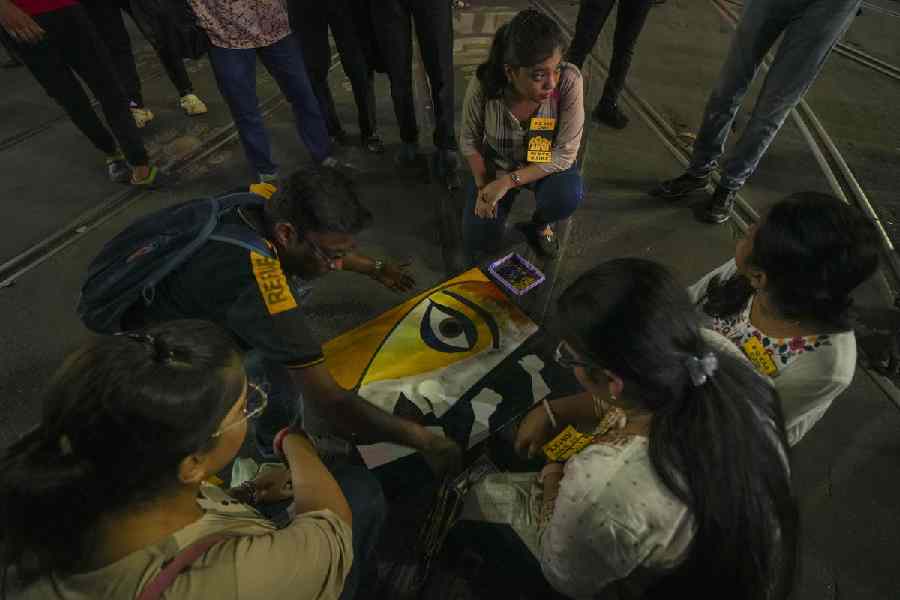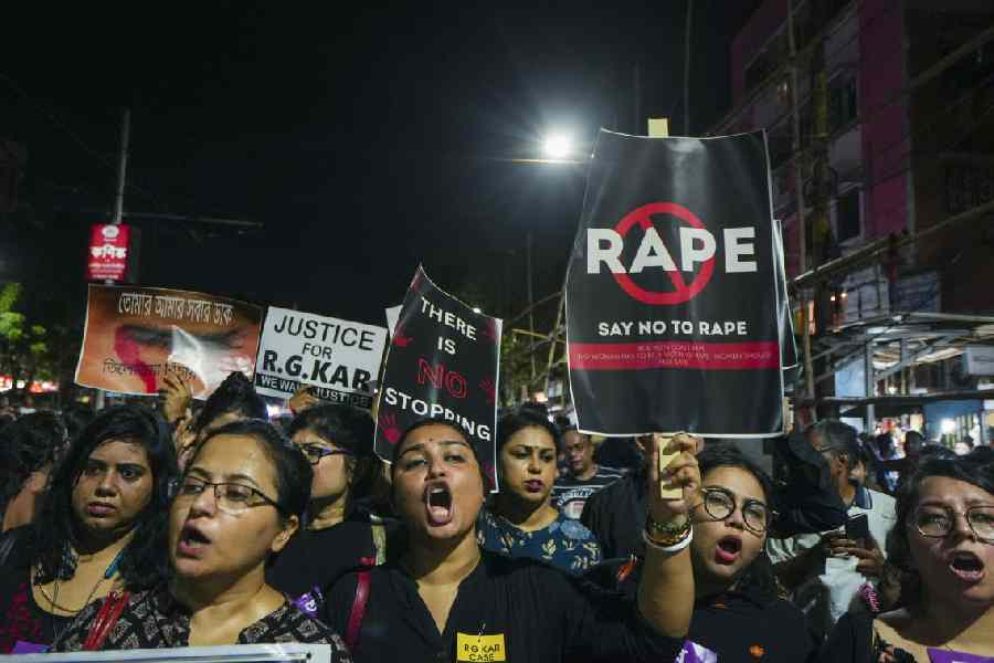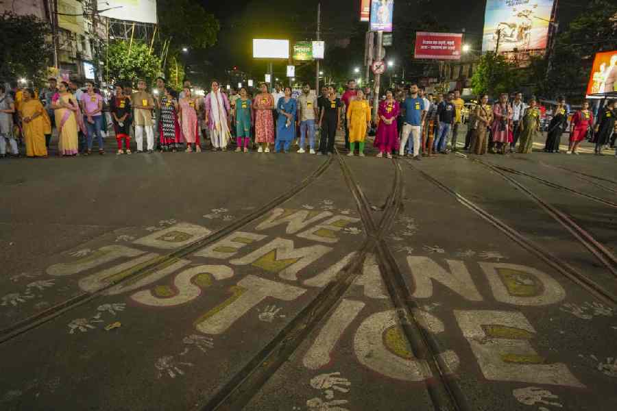 Singing Arijit Sing's song 'Aar kabe' (how long) in solidarity with sexually violated women, the protesters held aloft placards demanding speedy investigation and justice in the R G Kar murder-rape incident.