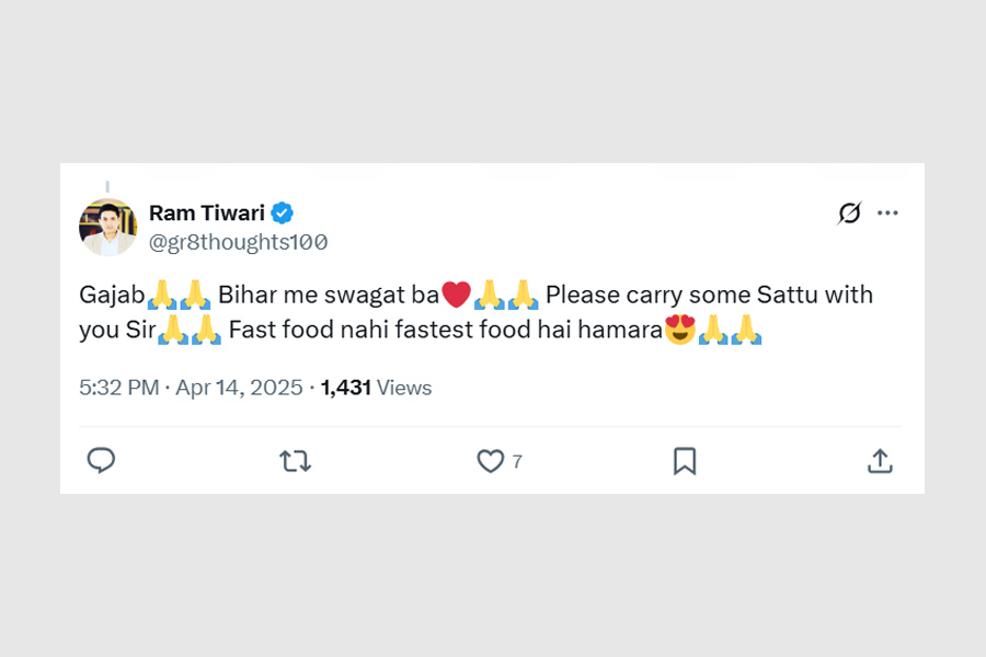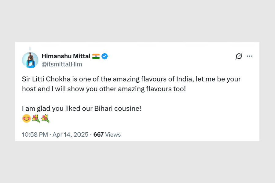 “Namaste, Bihar! Finally had the chance to try the world-famous Litti Chokha—Gajab Swad Ba!” he said on X, along with a photo of an array of other native Bihari dishes.