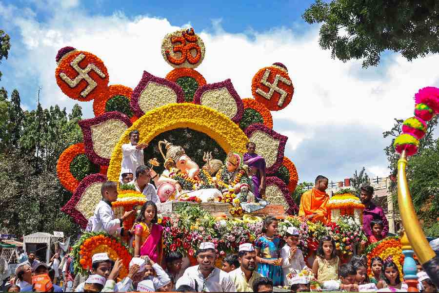 Devotees carry chariot of 'Mandai Sharda Gajanan Ganpati' idol on the ocassion of Ganesh Chaturthi festival, in Pune, Maharashtra.