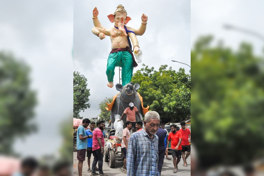 Devotees carry an idol of Lord Ganesha for the Ganesh Chaturthi festival, in Surat, Gujarat.