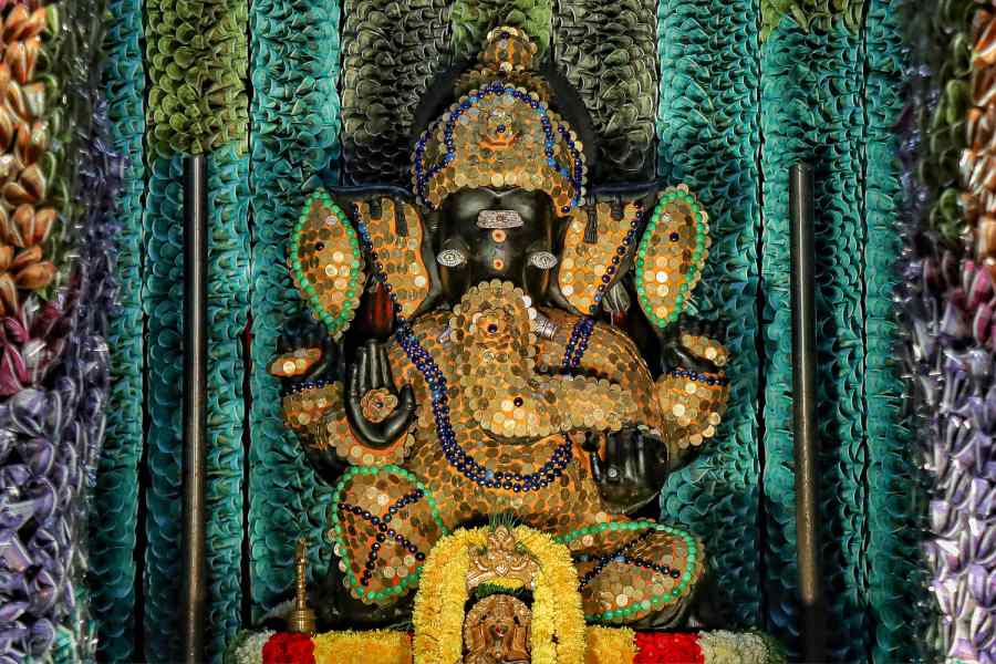 Sri Sathya Sai Ganapathy temple decorated with fifty lakhs coins and more than one crore currency notes on the occasion of Ganesha Chaturthi festival at J.P. Nagar, in Bengaluru.