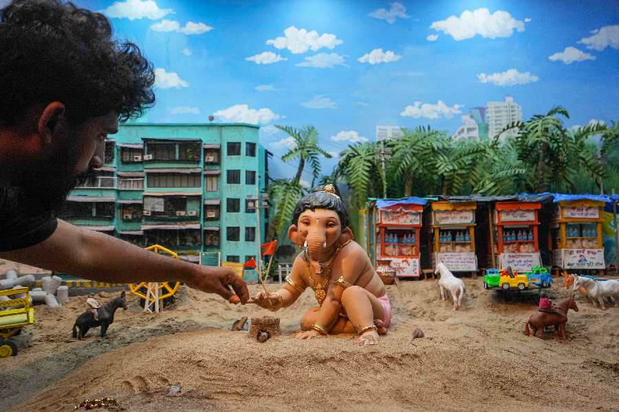 An artist working on a pandal, a replica of Shivaji Park beach, for 'Ganesh Chaturthi' festival celebrations, in Mumbai.