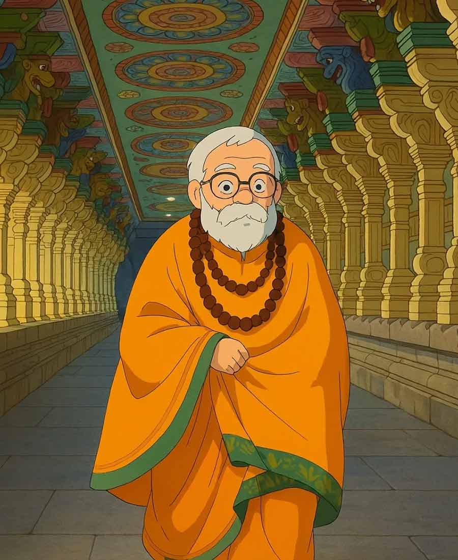 PM Modi dressed in a traditional orange robe with green borders, walking through a grand corridor. He is wearing a large wooden bead necklace (mala), giving him the appearance of a sage or spiritual figure.