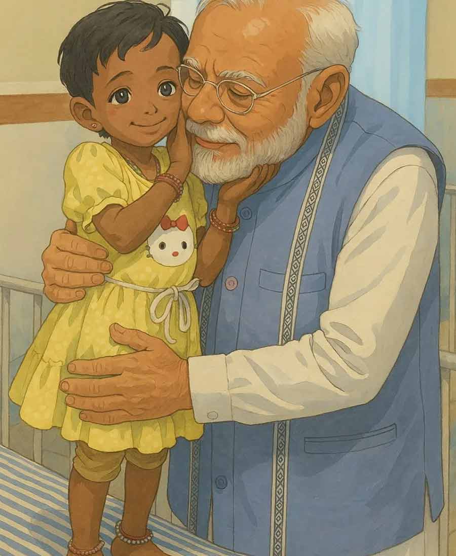 The image depicts PM Modi has a warm, affectionate smile and holding a young girl in his arms. The child is gently placing her small hand on the man’s cheek, while he holds her close with both arms wrapped securely around her.