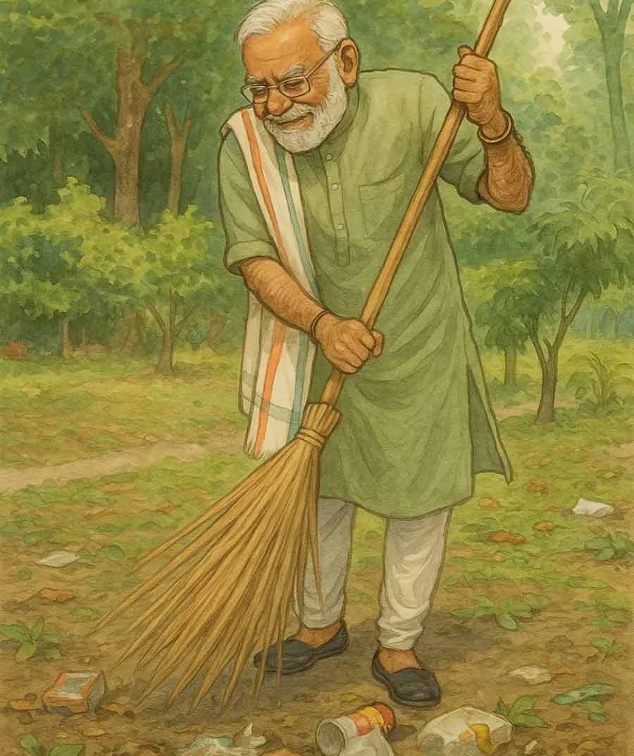 PM Modi is sweeping an outdoor area with a broom. A striped cloth (gamcha) is draped over his left shoulder. He is focusing on cleaning the littered ground, which is scattered with plastic cups, wrappers, and cans.