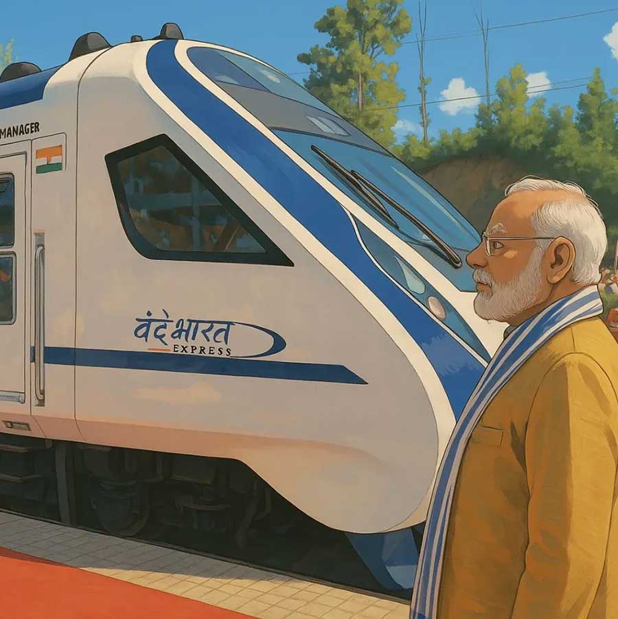 PM Modi standing in front of the Vande Bharat Express train. The name of the train is clearly visible in both Hindi and English on its side, along with the Indian flag and the word 'Manager' written near one of the doors.