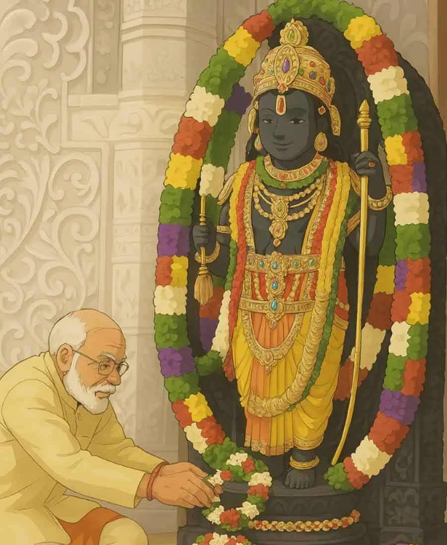 PM Modi is offering a garland of colorful flowers to a deity statue. He is kneeling and carefully placing the garland with both hands. He is wearing a red thread bracelet on his wrist, a common symbol of religious or spiritual practice in Hindu culture.