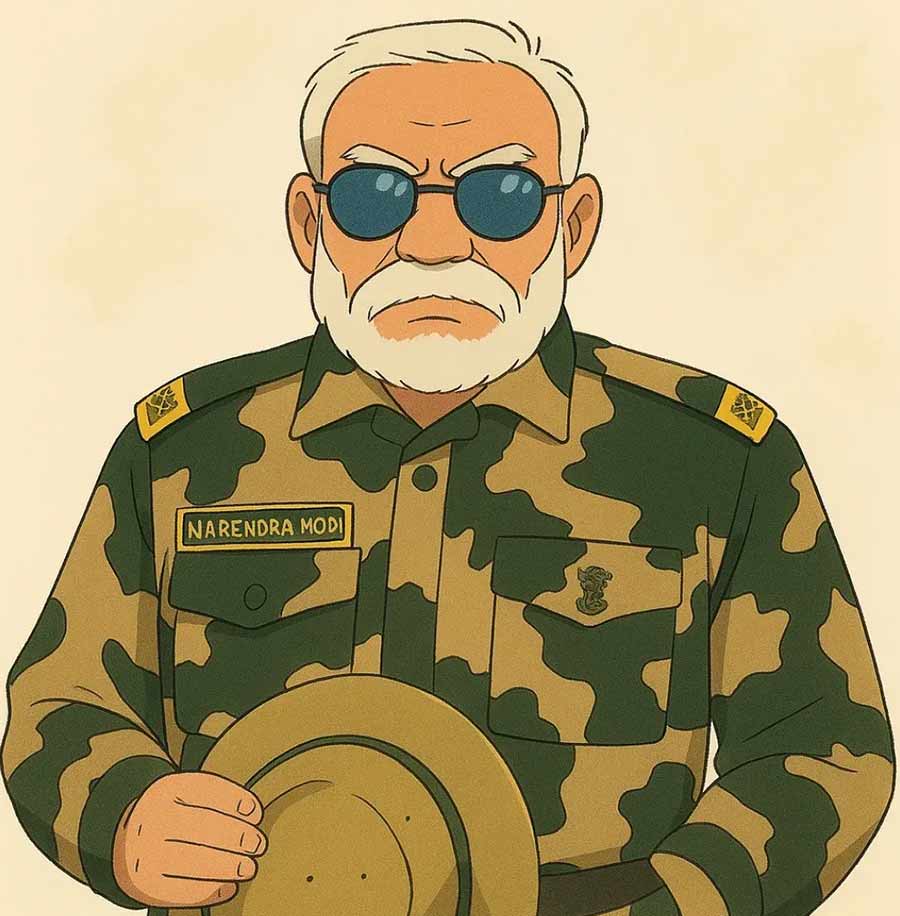 PM Modi is wearing a camouflage military uniform. His expression is serious and stern, with furrowed eyebrows and a firm gaze. He is wearing round, reflective sunglasses with blue-tinted lenses, adding to his commanding and enigmatic presence.