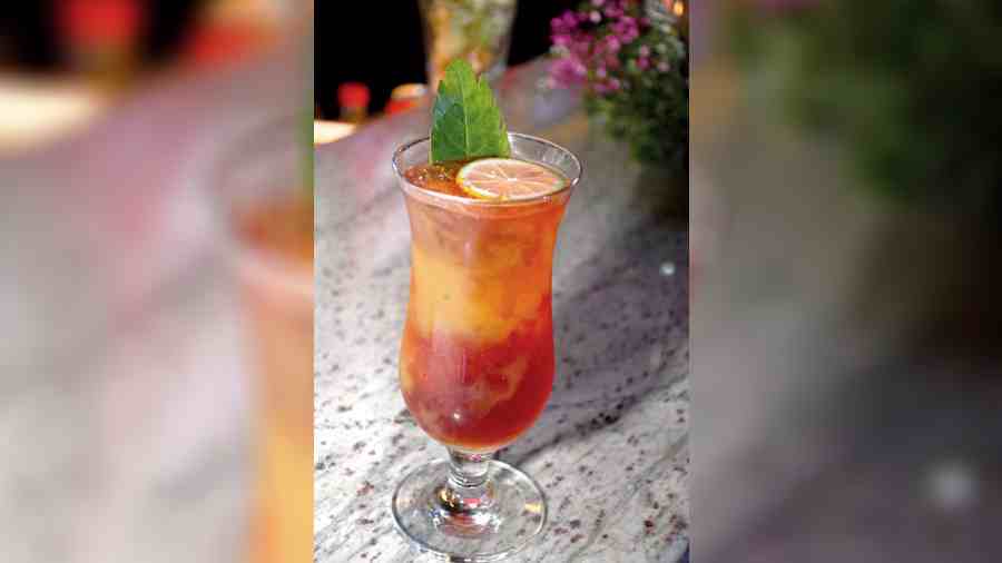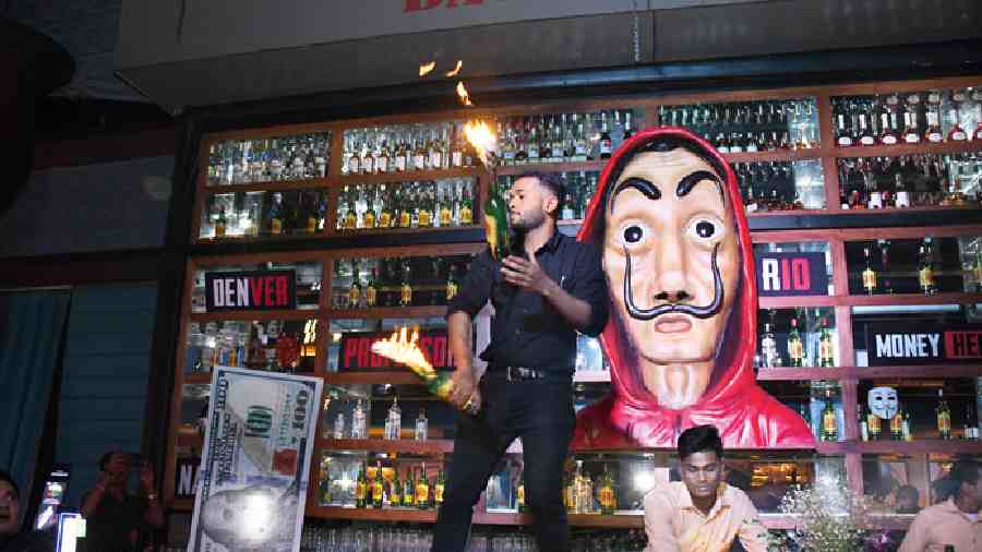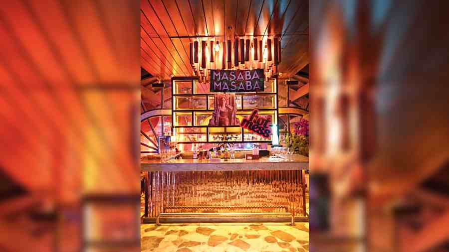 If the main bar below was termed as the Money Heist Bar that saw flair bartending and fire juggling, the private bar on the mezzanine rooftop was a “hot mess Masaba” bar that poured whisky, gin, vodka, wine, rum and beer! When Cucumber Met Basil and Long Island Iced Tea were popular cocktails.