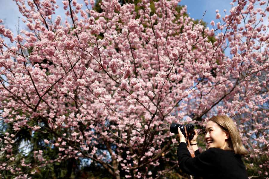A visitor takes a photo of early-flowering cherry blossoms in full bloom at a park in Tokyo, Japan. (Reuters)