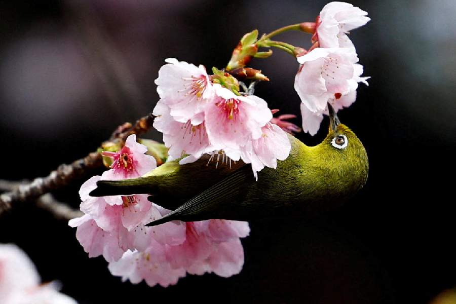 A white-eye bird is seen on an early-flowering Ookanzakura cherry blossoms in full bloom at Ueno Park in Tokyo, Japan. (Reuters)