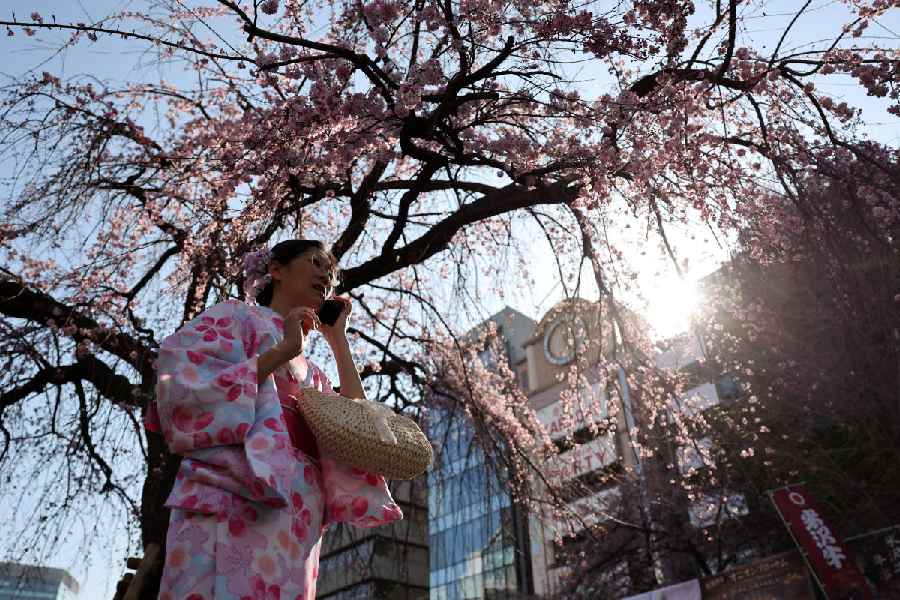 A visitor wearing a kimono uses her mobile phone under the early-flowering cherry blossoms at Ueno Park in Tokyo, Japan, March 17, 2026. (Reuters)