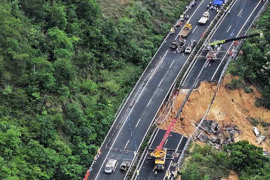 A section of a mountainside expressway collapsed on May 1 after a month of heavy rains in a mountainous part of southern Guangdong province in China. Over 56 centimeters (22 inches) of rain has fallen in the past four weeks in the county where the roadway collapsed, more than four times as much as last year. Some villages in Meizhou were flooded in early April, and the city has received additional rain in recent days.