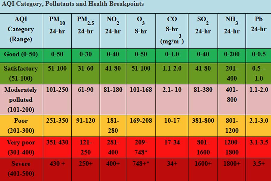 The Air Quality Index (AQI) is divided into six different categories: Good (0-50), Satisfactory (51-100), Moderately Polluted (101-200), Poor (201-300), Very Poor (301-400), and Severe (401-500). It is calculated using eight pollutants: PM10, PM2.5, NO2, SO2, CO, O3, NH3, and Pb, based on their 24-hour average levels. Further a sub-index is determined for each pollutant, and the highest sub-index shows the overall AQI.