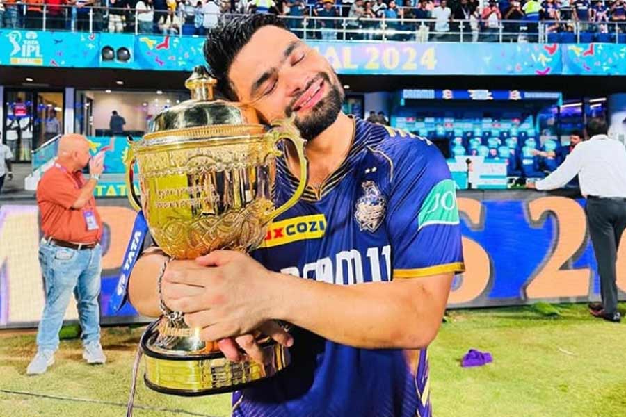 The KKR finisher, fresh off his first-ever IPL win, clutched the trophy in a tight embrace, his face glowing with joy.