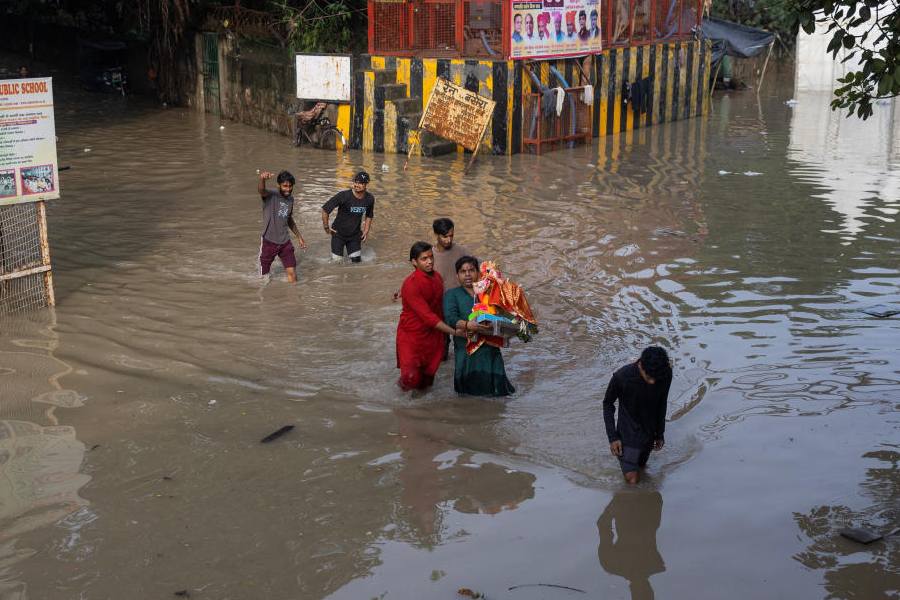 People waded through floodwaters in areas surrounding the historic Red Fort, many carrying an idol of Lord Ganesha, that is often immersed in river waters in a Hindu ritual at this time of year.