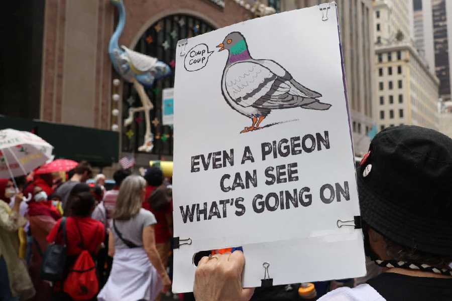Thousands of people also marched through downtown Portland, Oregon, while in San Francisco, hundreds spelled out the words “Impeach & Remove” on a sandy beach along the Pacific Ocean, also with an inverted US flag.