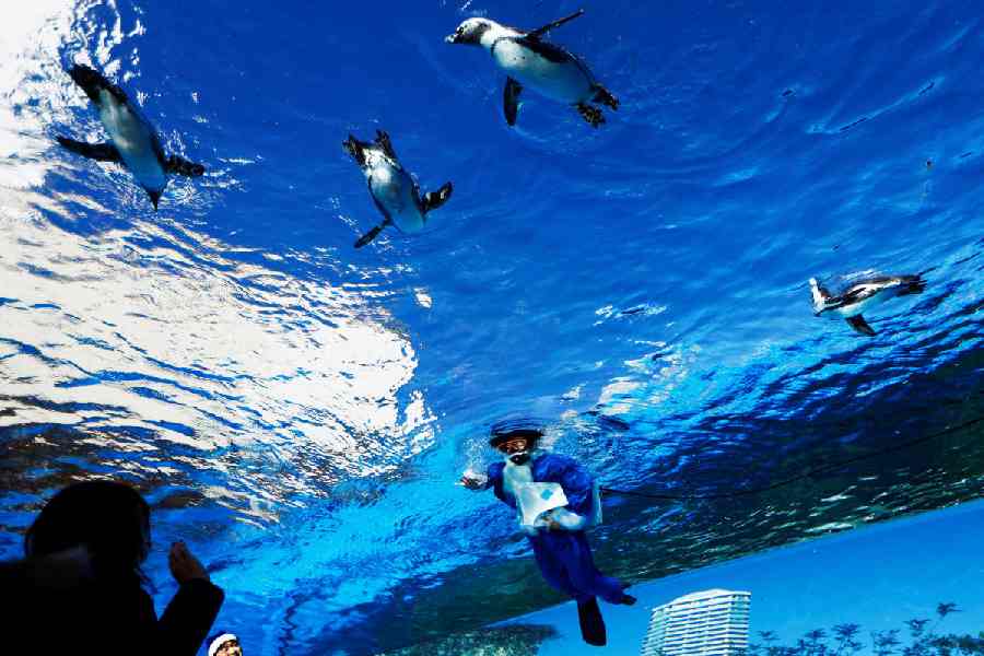 A diver wearing a blue Santa Claus costume swims inside the 'Penguins in the Sky' tank with African penguins at Sunshine Aquarium in Tokyo, Japan, December 24, 2024. Reuters