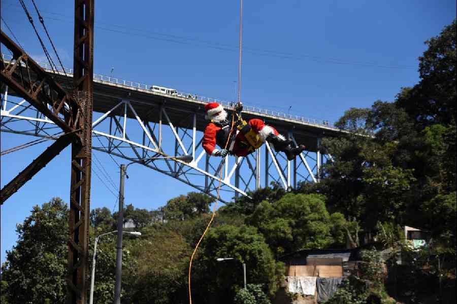 Guatemalan firefighter Hector Chacon, dressed as Santa Claus, rappels down the Las Vacas bridge to deliver toys to children in the Jesus de la Buena Esperanza neighborhood in Guatemala City, Guatemala, December 22, 2024. Reuters