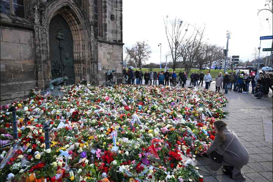 People stand next to flowers and candles left as a tribute near the 'Alter Markt' Christmas market, where a man drove a car into the crowd through an emergency exit route on Friday evening, in Magdeburg, Germany December 22, 2024. Reuters